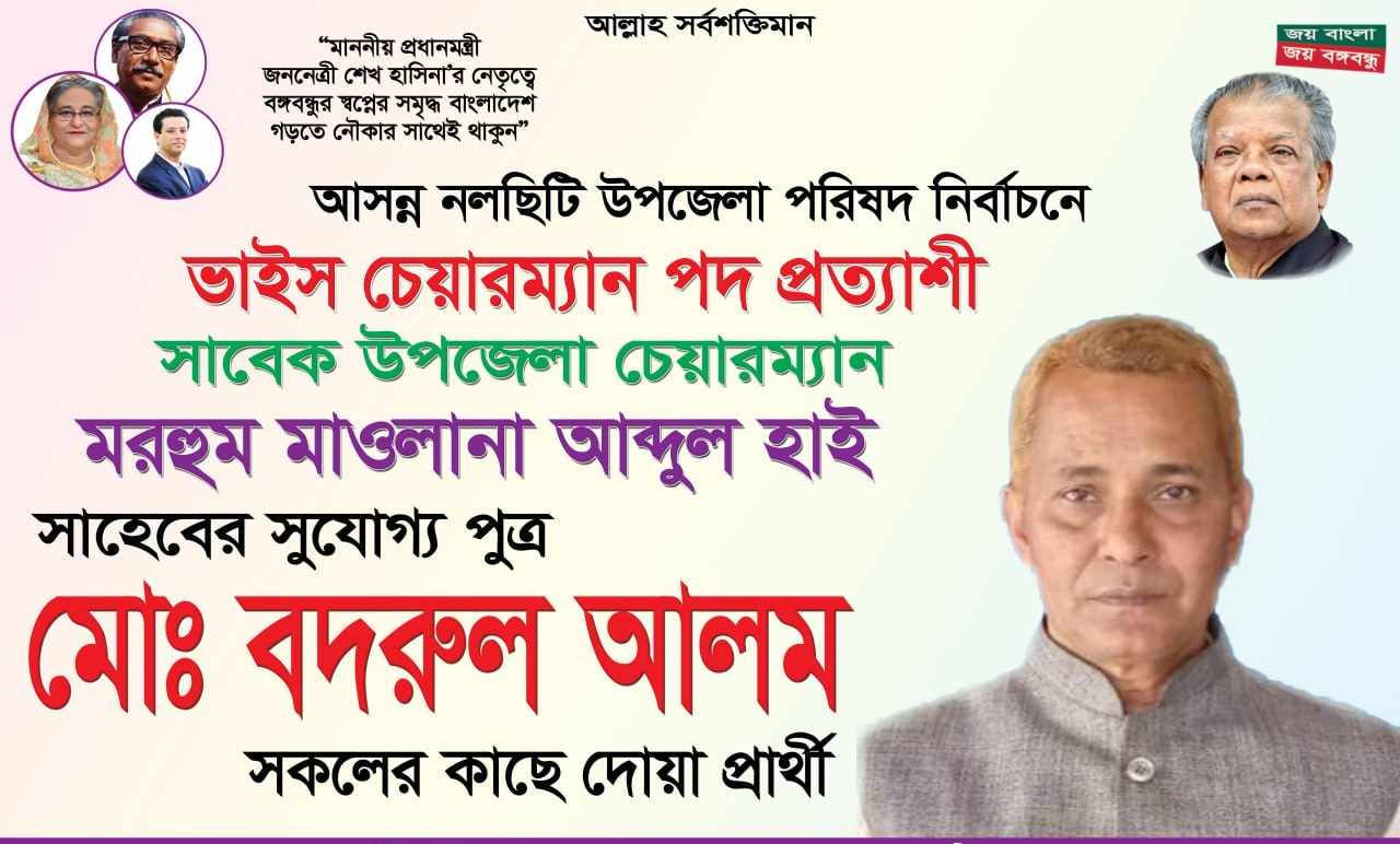 নিজস্ব প্রতিবেদক:: সাবেক উপজেলা চেয়ারম্যান’র মরহুম মাওলানা আব্দুল হাই’র ছেলে বদরুল আলম’কে উপজেলা ভাইস চেয়ারম্যান হিসেবে দেখতে চায় নলছিটিবাসী। জাতীয় সংসদ নির্বাচন শেষ হতে না হতেই চলছে নলছিটি উপজেলা পরিষদ নির্বাচনের হাওয়া। উপজেলা পরিষদ নির্বাচনের তফসিল ঘোষণা হওয়ার খবরে সম্ভাব্য প্রার্থীরা আটঘাট বেঁধেই মাঠে নেমেছেন।