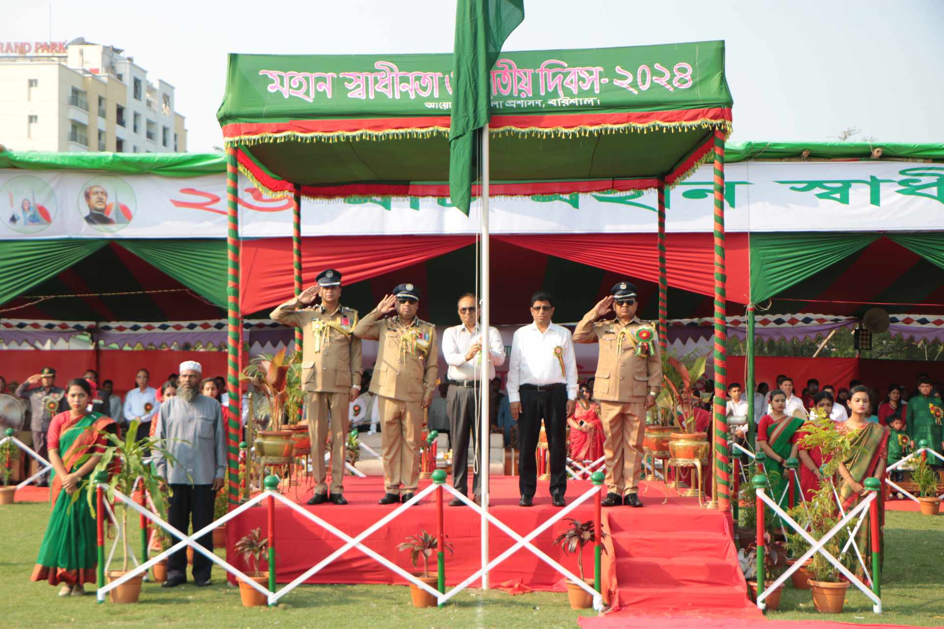 নিউজ ডেস্ক: ২৬ মার্চ মহান স্বাধীনতা ও জাতীয় দিবস ২০২৪ উদ্যাপন উপলক্ষ্যে জেলা প্রশাসন বরিশালের আয়োজনে যথাযথ মর্যাদায় বিভিন্ন আয়োজনের মধ্য দিয়ে দিবসটি উদ্যাপন করা হয়। আজ ২৬ মার্চ মঙ্গলবার সূর্যোদয়ের সাথে সাথে শহীদ মুক্তিযোদ্ধা স্মৃতি ফলকে বিভাগীয় ও জেলা প্রশাসন বরিশালের নেতৃত্বে জেলা প্রশাসকের কার্যালয় সংলগ্ন শহীদ মুক্তিযোদ্ধা স্মৃতি ফলকে পুষ্পস্তবক অর্পণের মাধ্যমে মহান স্বাধীনতা ও জাতীয় দিবস এর শুভ সূচনা করা হয়। এসময় বিভাগীয় কমিশনার ও জেলা প্রশাসকসহ সরকারের বিভিন্ন দপ্তর পুষ্পস্তবক অর্পণ করে। পরে কীর্তনখোলা নদী সংলগ্ন ত্রিশ গোডাউন বধ্যভূমি স্মৃতিস্তম্ভ অভিমুখে পদযাত্রা শেষে সেখানে বিভাগীয় প্রশাসন ও জেলা প্রশাসন বরিশালসহ সরকারি-বেসরকারি বিভিন্ন প্রতিষ্ঠান পুষ্পস্তবক অর্পন করেন। সেখান থেকে শহিদ এডিসি কাজী আজিজুল ইসলাম সমাধিসৌধে পুষ্পস্তবক অর্পণ করে তার রুহের মাগফেরাত কামনা করে দোয়া মোনাজাত করা হয়। সকাল সাড়ে ৮ টায় নগরীর বঙ্গবন্ধু উদ্যানে বিভাগীয় কমিশনার মোঃ শওকত আলী কর্তৃক আনুষ্ঠানিকভাবে জাতীয় পতাকা উত্তোলন-কুচকাওয়াজ ও বেলুন ফেস্টুন এবং শান্তির প্রতীক পায়রা উড়িয়ে মহান বিজয় দিবসের শুভ সূচনা করা হয়। পরে কুচকাওয়াজ প্রদর্শনী শেষে দেশের ঐতিহ্যবাহী লাঠি খেলা অনুষ্ঠিত হয়। অনুষ্ঠানে প্রধান অতিথি ছিলেন বিভাগীয় কমিশনার বরিশাল মোঃ শওকত আলী। অনুষ্ঠানে সভাপতিত্ব করেন জেলা প্রশাসক, বরিশাল শহিদুল ইসলাম। বিশেষ অতিথি ছিলেন ডিআইজি বরিশাল রেঞ্জ, বরিশাল মোঃ জামিল হাসান বিপিএম-সেবা, পিপিএম; পুলিশ কমিশনার, বরিশাল মেট্রোপলিটন পুলিশ জিহাদুল কবির, বিপিএম-সেবা, পিপিএম; পুলিশ সুপার, বরিশাল ওয়াহিদুল ইসলাম বিপিএম, বীর মুক্তিযোদ্ধারাসহ অন্যন্য অতিথিরা উপস্থিত ছিলেন। এছাড়াও সুবিধাজনক সময়ে সকল শহীদদের আত্মার মাগফিরাত কামনা করে কালেক্টরেট জামে মসজিদে দোয়া মোনাজাতের আয়োজন করা হবে।
