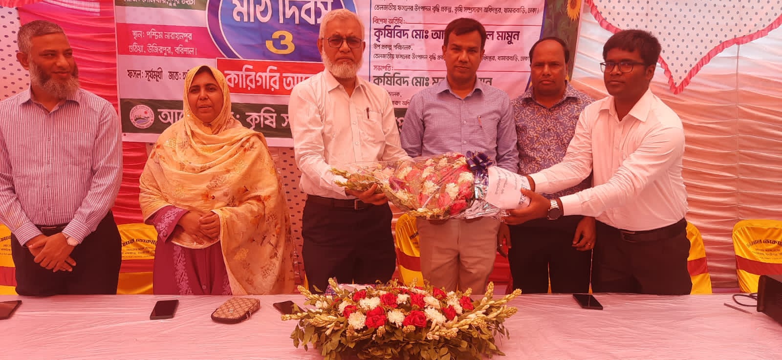 মো: এমদাদুল কাসেম সেন্টু, ,উজিরপুর প্রতিনিধিঃ বরিশালের উজিরপুর উপজেলার গুঠিয়া ইউনিয়নের নারায়নপুর ব্লকে তেল জাতীয় ফসলের উৎপাদন বৃদ্ধি প্রকল্পের আওতায় সুর্যমুখী ফসলের মাঠ দিবস অনুষ্ঠিত হয়েছে। ৩১ মার্চ রবিবার বিকাল ৪ টায় মাঠ দিবস অনুষ্ঠানে প্রধান অতিথির বক্তৃতা করেন প্রকল্পের প্রকল্প পরিচালক মুহম্মদ আরশেদ আলী চৌধুরী। এছাড়া কৃষি সম্প্রসারণ অধিদপ্তর, বরিশালের উপপরিচালক মোঃ মুরাদুল হাসানের সভাপতিত্বে ও উজিরপুর উপজেলা উপ-সহকারী কৃষি কর্মকর্তা মোঃ তোফাজ্জেল হোসেন তুহিন এর সঞ্চালনায় বক্তৃতা করেন উজিরপুর উপজেলা কৃষি কর্মকর্তা কপিল বিশ্বাস,অতিরিক্ত কৃষি কর্মকর্তা প্রশান্ত হাওলাদার। উপস্থিত ছিলেন বিভিন্ন সামাজিক ও রাজনৈতিক নেতৃবৃন্দ। এসময় বক্তারা,দেশে তেলের ঘাটতি পূরনে সরিষা ও সূর্যমুখীর আবাদ বৃদ্ধিসহ অনাবাদি পতিত জমিতে তেল ফসলের আওতায় আনার তাগিদ দেন এবং বিদেশী ভেজাল তেল খাওয়া থেকে বিরত থেকে স্বাস্থ্য সম্মত সূর্যমুখী ও সরিষার তেল খাওয়ার পরামর্শ দেন তারা। এছাড়াও বিভিন্ন দিক নির্দেশনা মূলক আলোচনা করেন উপস্থিত অতিথি বৃন্দ।