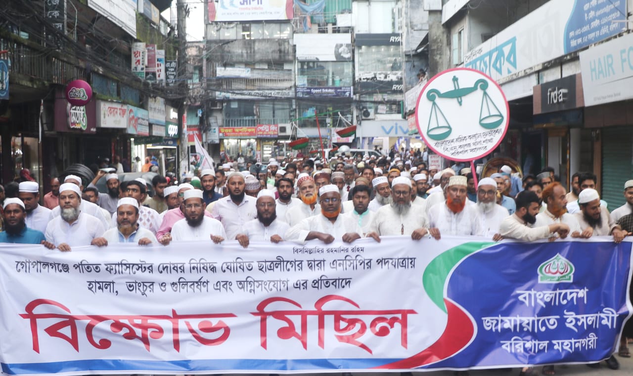 গোপালগঞ্জে জুলাই যোদ্ধাদের উপরে হামলার প্রতিবাদে বরিশাল জামায়াতের বিক্ষোভ মিছিল