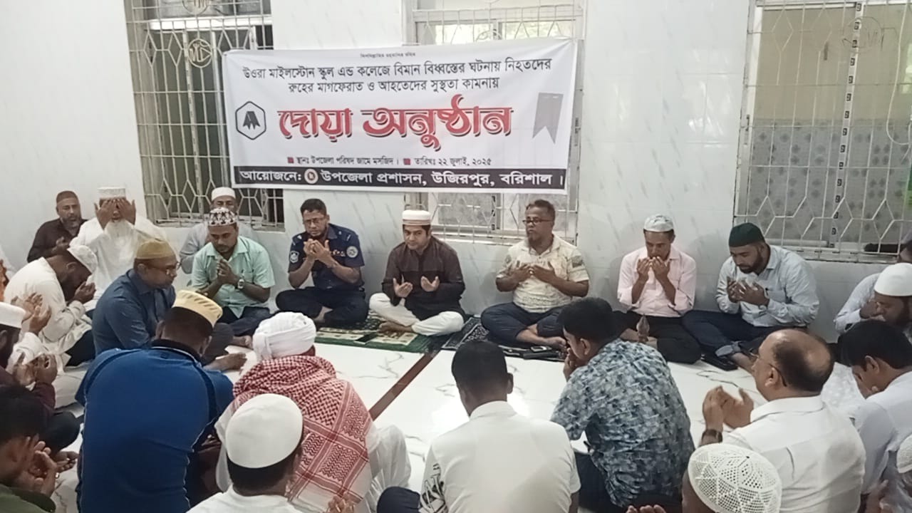 মো:এমদাদুল কাসেম সেন্টু, উজিরপুর প্রতিনিধিঃ বরিশালের উজিরপুর উপজেলা প্রশাসনের উদ্যোগে ঢাকা উত্তরা মাইলস্টোন স্কুল এন্ড কলেজ বিমান বিধ্বস্তে নিহত শিক্ষক,শিক্ষার্থীদের রুহের মাগফেরাত কামনা ও আহতদের সুস্থতা কামনায় দোয়া মোনাজাত অনুষ্ঠিত হয়েছে। ২২ জুলাই যোহরবাদ উজিরপুর উপজেলা পরিষদ জামে মসজিদে উপজেলা নির্বাহী কর্মকর্তা মোঃ আলী সুজার সভাপতিত্বে দোয়া অনুষ্ঠান অনুষ্ঠিত হয়। এসময় উপস্থিত ছিলেন উজিরপুর মডেল থানার অফিসার ইনচার্জ মোঃ আব্দুস সালাম, উপজেলা সমাজসেবা কর্মকর্তা মোঃ আবুল কালাম আজাদ, উপজেলা নির্বাচন অফিসার মোঃ জাহিদুল ইসলাম,উপজেলা জামায়াতে ইসলামীর আমীর মাওঃ আব্দুল খালেক, সাধারণ সম্পাদক মোঃ খোকন, ইসলামী আন্দোলন বাংলাদেশ উজিরপুর উপজেলা শাখার যুব আন্দোলনের সভাপতি ডিএম আল আমিন,দোয়া মোনাজাত পরিচালনা করেন উজিরপুর আলিম মাদ্রাসার অধ্যাক্ষ ও উজিরপুর উপজেলা পরিষদ জামে মসজিদের ইমাম মাওলানা নুরুল হক আযাহারী। এছাড়াও উপস্থিত ছিলেন বিভিন্ন সামাজিক ও রাজনৈতিক নের্তৃবৃন্দ। এসময় উত্তরা মাইলস্টোন স্কুল এন্ড কলেজে বিমান বিধ্বস্তে নিহতদের রুহের মাগফেরাত কামনা ও আহতদের সুস্থতা কামনায় দোয়া মোনাজাত অনুষ্ঠিত হয়।