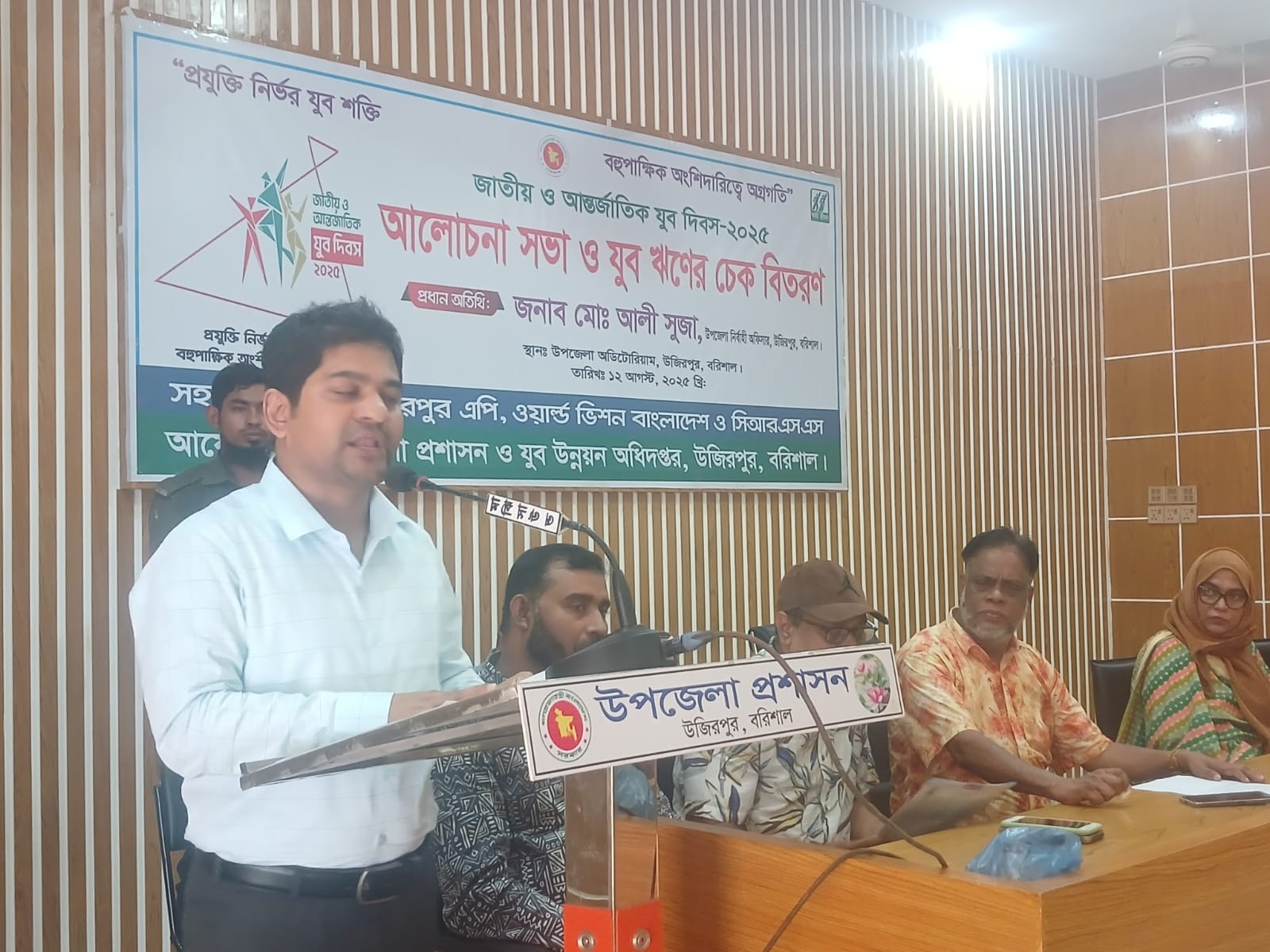 মোঃএমদাদুল কাসেম সেন্টু, উজিরপুর প্রতিনিধিঃ বরিশালের উজিরপুর উপজেলায় "প্রযুক্তি নির্ভর যুব শক্তি, বহুপাক্ষিক অংশিদারিত্বে অগ্রগতি" এই প্রতিপাদ্যকে সামনে রেখে জাতীয় ও আন্তর্জাতিক যুব দিবস উপলক্ষে উপজেলা প্রশাসন ও যুব উন্নয়ন অধিদপ্তরের আয়োজনে, উজিরপুর এপি, ওয়ার্ল্ড ভিশন বাংলাদেশ ও সিআরএসএস এর সহযোগিতায় আলোচনা সভা ও ৪ যুবক - যুবতীর মাঝে যুব ঋনের চেক বিতরন অনুষ্ঠিত হয়েছে। ১২ আগষ্ট মঙ্গলবার ১১টায় উপজেলা অডিটরিয়ামে উপজেলা যুব উন্নয়ন কর্মকর্তা আসমা বেগমের সভাপতিত্বে ও উপজেলা সহকারী যুব উন্নয়ন কর্মকর্তা আবুল কালাম আজাদ এর সঞ্চালনায় প্রধান অতিথির বক্তৃতা করেন উপজেলা নির্বাহী কর্মকর্তা মোঃ আলী সুজা। এছাড়াও বক্তৃতা করেন উপজেলা বিএনপির সিনিয়র সহ-সভাপতি এস এম আলাউদ্দিন, সফল যুবকদের পক্ষে বক্তব্য রাখেন মোঃ মনির হোসেন, বক্তব্য রাখেন উজিরপুর এপি, ওয়ার্ল্ড ভিশন বাংলাদেশ এর প্রোগ্রাম ম্যানেজার সিলভিয়া ডেইজি, উপজেলা সমবায় কর্মকর্তা মোঃ রিয়াদ খান। উপস্থিত ছিলেন উজিরপুর প্রেসক্লাবের সভাপতি মোঃ এমদাদুল কাশেম সেন্টু,সাধারণ সম্পাদক মোঃ নাসির উদ্দিন শরীফ। আরো উপস্থিত ছিলেন বিভিন্ন দপ্তরের কর্মকর্তা, কর্মচারী ও বিভিন্ন ইউনিয়নের যুবক ও যুবতীরা। এসময় প্রধান অতিথি উপজেলা নির্বাহী কর্মকর্তা মোঃ আলী সুজা উপস্থিত সকলকে শপথ বাক্য পাঠ করান এবং বিশদ আলোচনা করেন।