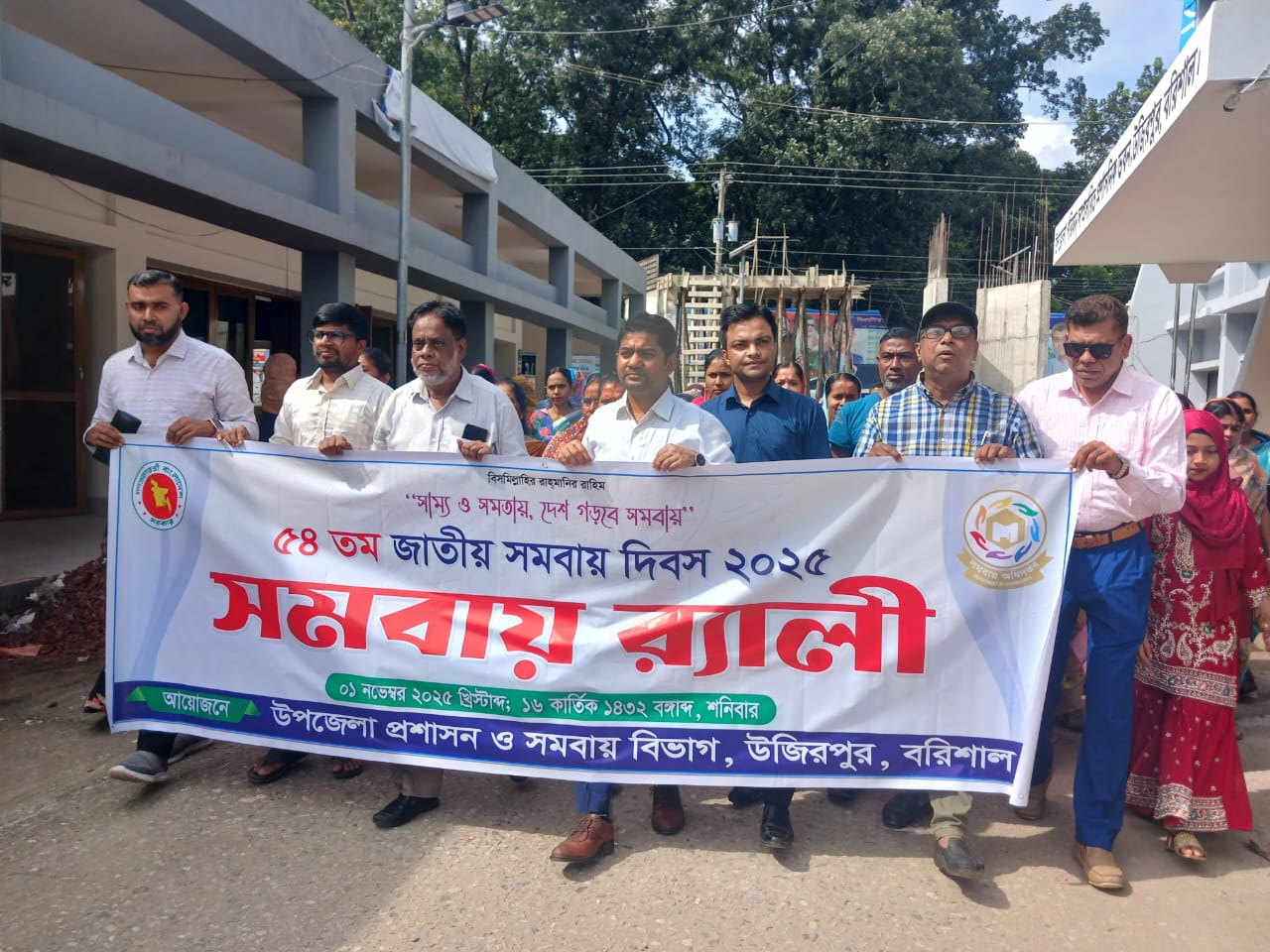 মোঃএমদাদুল কাসেম সেন্টু, উজিরপুর প্রতিনিধিঃ "সাম্য ও সমতায়, দেশ গড়বে সমবায়" এই প্রতিপাদ্যকে সামনে রেখে বরিশালের উজিরপুর উপজেলায় উপজেলা প্রশাসন ও সমবায় বিভাগের আয়োজনে ৫৪ তম জাতীয় সমবায় দিবস উপলক্ষে র্যালি ও আলোচনা সভা অনুষ্ঠিত হয়েছে। ১ নভেম্বর শনিবার বেলা ১১ টায়, উপজেলা পরিষদ হলরুমে, উপজেলা সমবায় কর্মকর্তা রিয়াদ খানের সভাপতিত্বে ও উপজেলা সমবায় কার্যালয়ের সহকারী পরিদর্শক মাইনুল হোসেন খানের সঞ্চালনায়, প্রধান অতিথি ছিলেন উপজেলা নির্বাহী কর্মকর্তা মোঃ আলী সুজা, বিশেষ অতিথি ছিলেন উপজেলা সহকারী কমিশনার ভুমি কর্মকর্তা মহেশ্বর মন্ডল। এছারাও উপস্থিত ছিলেন উপজেলা বিএনপির সিনিয়র সহ-সভাপতি এস এম আলাউদ্দিন, উপজেলা মৎস্য কর্মকর্তা প্রসেন মজুমদার, উপজেলা পরিসংখ্যান কর্মকর্তা(ভারপ্রাপ্ত) মোঃ নুর হোসেন । শুরুতে জাতীয় পতাকা উত্তোলনের মধ্য দিয়ে অনুষ্ঠান শুরু হয় । জাতীয় পতাকা উত্তোলন ও র্যালি শেষে, আলোচনা সভা অনুষ্ঠিত হয়েছে। সমবায়ীদের মধ্যে বক্তব্য রাখেন বরিশাল জেলা তাতী সমিতির সহ-সভাপতি মোঃ সাহিন মিয়া, দক্ষিণ কারফা মৎস্য উৎপাদনকারী সমবায় সমিতির সহ-সভাপতি মনিকা রানী বৈদ্য সহ বিভিন্ন সরকারী দপ্তরের কর্মকর্তা কর্মচারী, রাজনৈতিক, সামাজিক ব্যাক্তিবর্গ বিভিন্ন ইউনিয়ন থেকে আগত সমবায়ী বৃন্দ উপস্থিত ছিলেন। প্রধান অতিথি বিভিন্ন দিক নির্দেশনা মুলক বক্তব্য রাখেন।