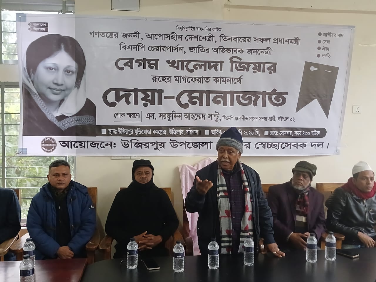 মোঃএমদাদুল কাসেম সেন্টু, উজিরপুর প্রতিনিধিঃ বাংলাদেশের ৩ বারের সফল নারী প্রধানমন্ত্রী মরহুমা বেগম খালেদা জিয়ার রুহের মাগফিরাত কামনায় উপজেলা ও পৌর সেচ্ছাসেবক দলের উদ্যোগে দোয়া ও মোনাজাত অনুষ্ঠিত হয়েছে। ৫ জানুয়ারি সোমবার বিকেলে উজিরপুর উপজেলা মুক্তিযোদ্ধা ভবনের সভাকক্ষে দোয়া ও মোনাজাত অনুষ্ঠিত হয়। উপজেলা সেচ্ছাসেবক দলের আহবায়ক মোঃ মাহাবুবুর রহমান গোমস্তার সভাপতিত্বে ও পৌর সেচ্ছাসেবক দলের আহবায়ক মোঃ মিলন হাওলাদারের সঞ্চালনায়, উপস্থিত ছিলেন বাংলাদেশ জাতীয়তাবাদী দল বিএনপির কেন্দ্রীয় কমিটির সদস্য, বরিশাল জেলা বিএনপির যুগ্ম-আহবায়ক, উজিরপুর উপজেলা বিএনপির সভাপতি, গনমানুষের নেতা, বরিশাল-২ (উজিরপুর-বানারীপাড়া) আসনের বিএনপির ধানের শীষ প্রতীকের সংসদ সদস্য প্রার্থী ও বীর মুক্তিযোদ্ধা এস সরফুদ্দিন আহমেদ সান্টু , পৌর বিএনপির সভাপতি মোঃ শহিদুল ইসলাম খান, উপজেলা বিএনপির সিনিয়র সহ-সভাপতি এসএম আলাউদ্দিন,সিনিয়র যুগ্ম সাধারণ সম্পাদক সরদার সিদ্দিকুর রহমান, পৌর বিএনপির সাধারণ সম্পাদক মোঃ রোকনুজ্জামান টুলু, সাংগঠনিক সম্পাদক মোঃ সোহেল হাওলাদার, কেন্দ্রীয় সেচ্ছাসেবক দলের সদস্য মোঃ রফিকুল ইসলাম, কেন্দ্রীয় ছাত্র দলের সাবেক সহ-সাংগঠনিক সম্পাদক মোঃ ছবুর খান সাগর, উপজেলা সেচ্ছাসেবক দলের সদস্য সচিব মোঃ কইউম খান, পৌর সদস্য সদস্য সচিব মোঃ জুম্মান শিকদার মোতালেব । দোয়া ও মোনাজাত পরিচালনা করেন প্রশিক্ষা জামে মসজিদের ইমাম হাফেজ মাওলানা মোঃ সফিকুল ইসলাম। এছাড়াও উপস্থিত ছিলো শত শত নেতাকর্মী ও ধর্মপরায়ন মুসল্লী। দোয়া মোনাজাত অনুষ্ঠানে বিএনপির প্রার্থী এস সরফুদ্দিন আহমেদ সান্টু মরহুমা আপোষহীন দেশনেত্রী বেগম খালেদা জিয়ার আদর্শ ও সততা নিয়ে বিশদ আলোচনা করতে গিয়ে তিনি আবেগে আপ্লূত হয়ে পরেন। । এছাড়া মরহুমা বেগম খালেদা জিয়ার রুহের মাগফেরাত কামনায় দীর্ঘক্ষণ মোনাজাতের মাধ্যমে দোয়া প্রার্থনা করা হয়েছে।
