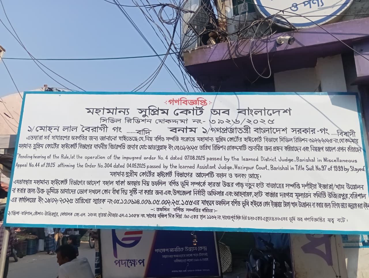 মোঃএমদাদুল কাসেম সেন্টু, উজিরপুর প্রতিনিধিঃ বরিশালের উজিরপুর উপজেলার হারতা বাজারে আদালতের নিষেধাজ্ঞা ও মামলা চলমান অবস্থায় থাকা স্বত্বেও ইজারা কার্যক্রমের ঘোষণা দেয়ায় ক্ষুব্ধ ও হতাশ ভুক্তভোগী সংখালঘু পরিবার ও ব্যবসায়ীসহ এলাকাবাসী। ভুক্তভোগী সংখ্যালঘু পরিবার সুত্রে জানা যায় উজিরপুর উপজেলার হারতায় জেএল ১৩ নং হারতা মৌজায় এসএ-১০৫৮নং দাগের দক্ষিণ দিক দিয়া.৬০ একর হাল ১১৩২ নং দাগের পূর্ব দিক দিয়া ৪.২৬ একর একুনে ৪.৮৬ একর ভূমি সংক্রান্ত মামলা চলমান রয়েছে। বাদী মোহনলাল বৈরাগী গং বনাম গনপ্রজাতন্ত্রী বাংলাদেশ সরকার গং বিবাদী। মহামান্য সুপ্রিম কোর্ট অব বাংলাদেশ, সিভিল রিভিশন মোকদ্দমা নং ৩৯২৬/২০২৫ এব যার গনবিজ্ঞপ্তি প্রকাশ করা হয়। এতে উল্লেখ থাকে এতদ্বারা সর্ব সাধারণের অবগতির জন্য জানানো যাইতেছে যে,নিম্ন বর্ণিত সম্পত্তি সংক্রান্ত মহামান্য সুপ্রিম কোর্টের হাইকোর্ট বিভাগে সিভিল রিভিশন ৩৯২৬/২০২৫নং মোকদ্দমায় মহামান্য সুপ্রিম কোর্টের হাইকোর্ট বিভাগের মাননীয় বিচারপতি জনাব মোঃ আজাবুল্লাহ ইং- ৩/৯/২০২৫ তারিখ রিভিশন মোকদ্দমাটি শুনানীর জন্য গ্রহন করিয়াছেন এবং নিম্নরূপ আদেশ প্রদান করিয়াছেন যে মহামান্য হাইকোর্ট বিভাগের আদেশ বহাল থাকা অবস্থায় নিম্ন তফসিল বর্ণিত ভূমি সম্পর্কে হারতা উত্তর পাড় নতুন হাট বাজারের সম্পত্তি দর্শাইয়া ইজারা/খাস উত্তোলন না করার জন্য উক্ত ভূমিতে আমাদের ভোগ দখলে কোন বাধা বিঘ্ন সৃষ্টি না করার জন্য এবং উপজেলা নির্বাহী অফিসার এবং আহবায়ক,হাট বাজার দরপত্র মূল্যায়ন কমিটি উজিরপুর,বরিশাল এর কার্যালয়ের ইং ১৮/২/২০২৫ তারিখের স্মারক নং০৫.১০.০৬৯৪.০০৬.০৫.০০২.২৫.১৫৫ এর মাধ্যমে তফসিল বর্ণিত ভূমি হইতে কোন ইজারার টাকা/খাস উত্তোলন না করার জন্য নির্দেশ দেন আদালত। এরপরে ইজারার জন্য কার্যক্রমের ঘোষণা দেয়ায় হতাশ সংখালঘু পরিবার,ব্যবসায়ী ও এলাকাবাসী। এ থেকে পরিত্রাণ পেতে প্রশাসনের উর্ধ্বতন কর্তৃপক্ষের সু-দৃষ্টি কামনা করেছেন ভুক্তভোগী সংখালঘু পরিবার ও এলাকাবাসী।