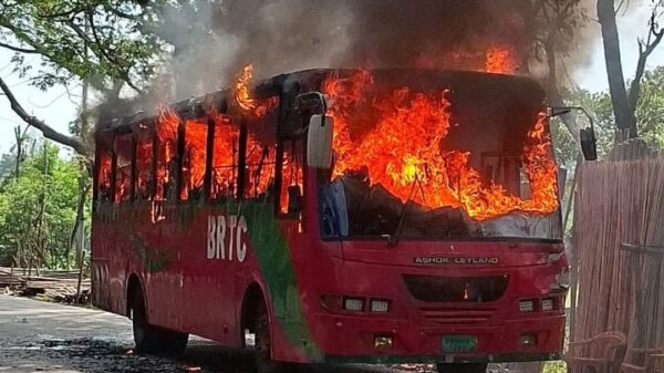 ঢাকা – বরিশাল মহাসড়কের উজিরপুর উপজেলায় ইসলাদী বাসস্টান্ডে বিআরটিসি বাসে ভয়াবহ অগ্নিকাণ্ড